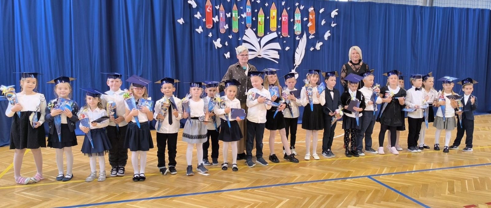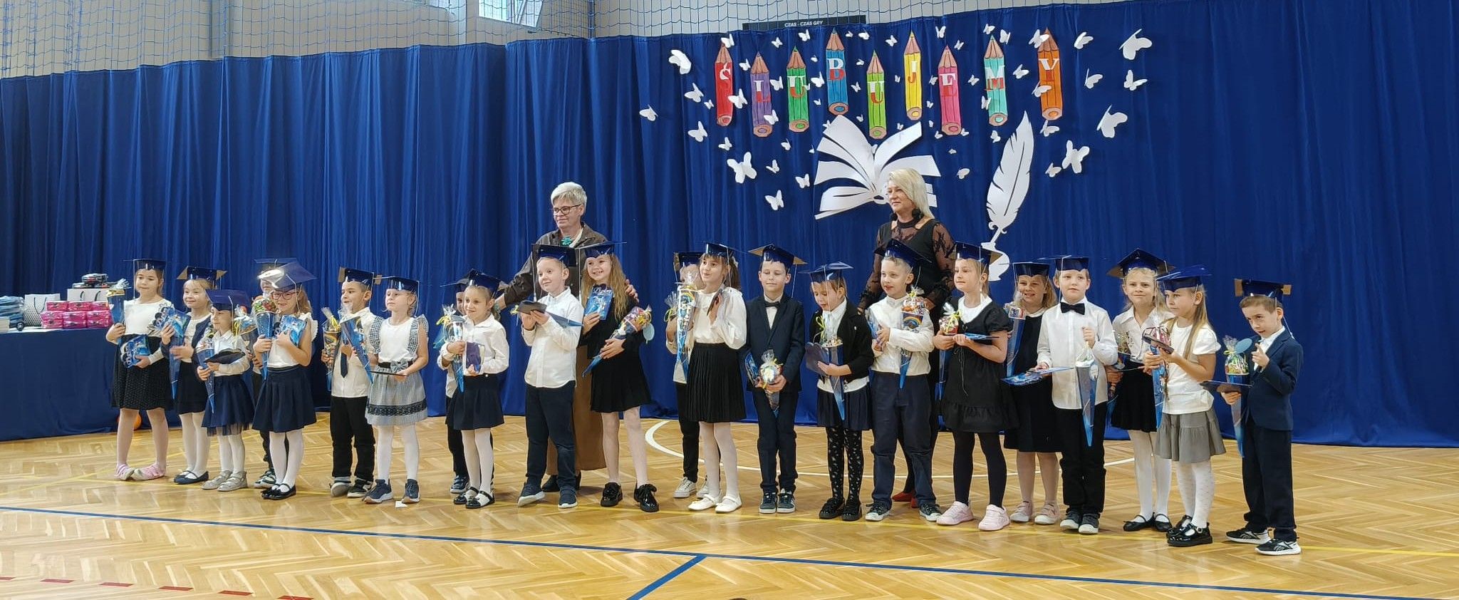 Po złożeniu uroczystego ślubowania, pani Jolanta Matuszczyk, dyrektor Zespołu Szkolno-Przedszkolnego nr 1 magicznym ołówkiem dokonała aktu pasowania na ucznia szkoły, którego ukoronowaniem było wręczenie legitymacji szkolnej oraz pamiątkowych dyplomów, mających przypominać dzieciom, że rozpoczęły kolejny etap edukacji. Od rodziców pierwszaki otrzymały na osłodę rogi obfitości.