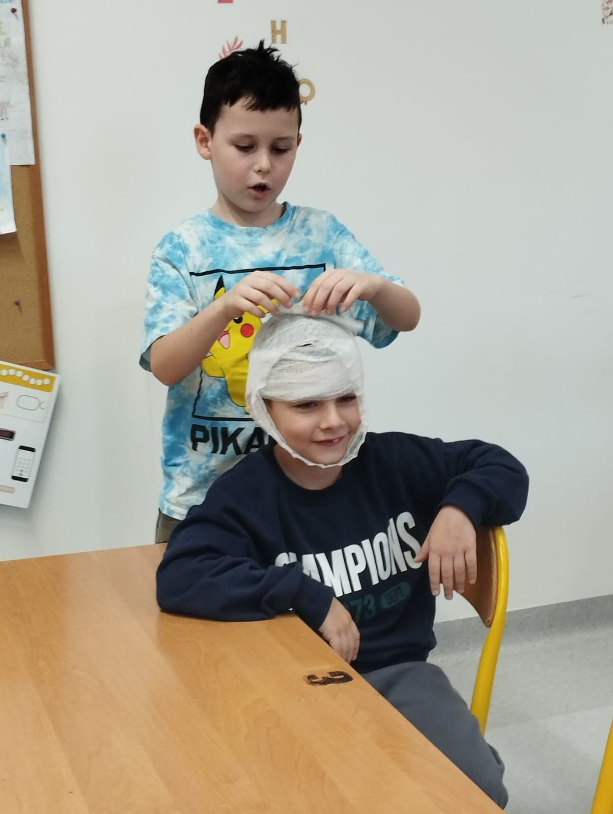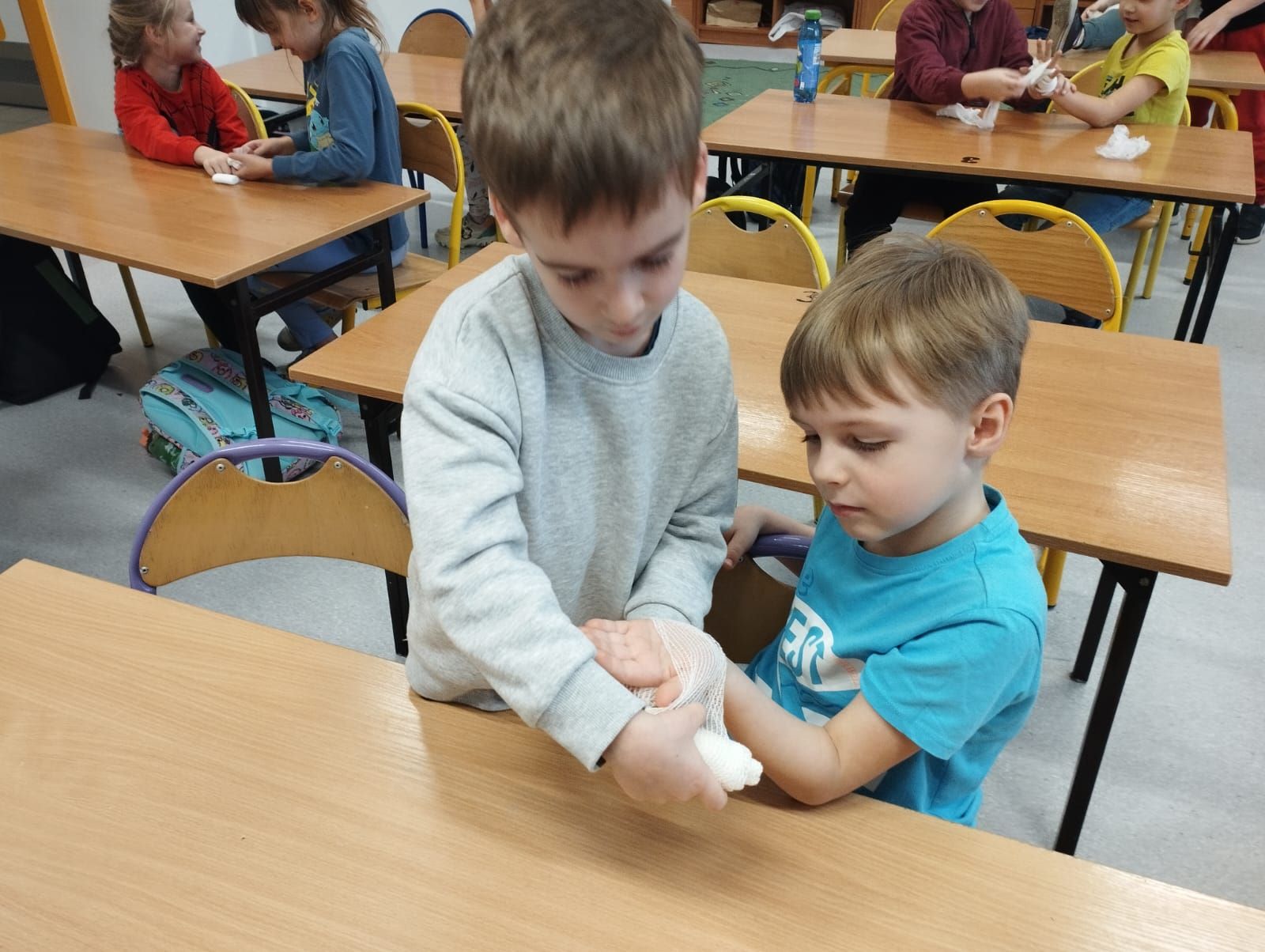 W klasie I przeprowadzono zajęcia dotyczące udzielania pierwszej pomocy. Uczniowie poznali podstawowe zasady reagowania w sytuacjach zagrożenia, takie jak sprawdzenie przytomności i wzywanie pomocy. Dzieci uczyły się również, jak prawidłowo ułożyć poszkodowanego w pozycji bezpiecznej oraz jak korzystać z numerów alarmowych.