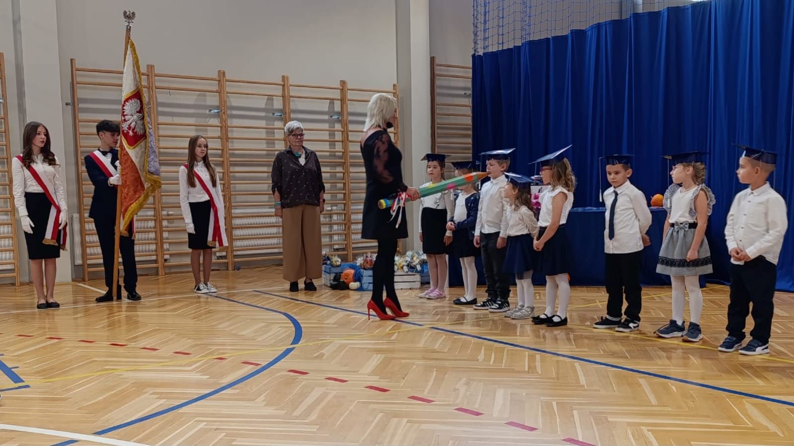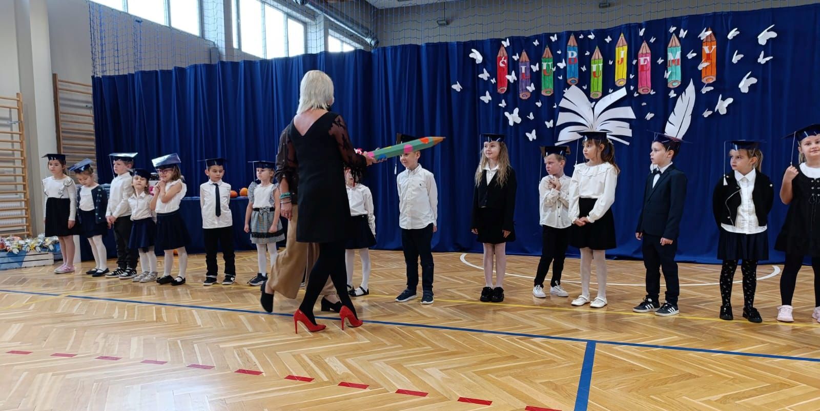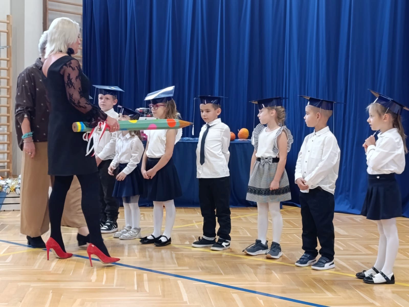 Po złożeniu uroczystego ślubowania, pani Jolanta Matuszczyk, dyrektor Zespołu Szkolno-Przedszkolnego nr 1 magicznym ołówkiem dokonała aktu pasowania na ucznia szkoły, którego ukoronowaniem było wręczenie legitymacji szkolnej oraz pamiątkowych dyplomów, mających przypominać dzieciom, że rozpoczęły kolejny etap edukacji. Od rodziców pierwszaki otrzymały na osłodę rogi obfitości.