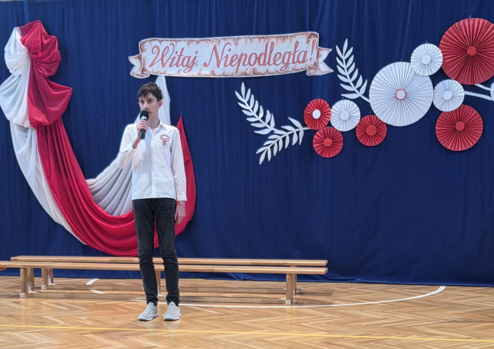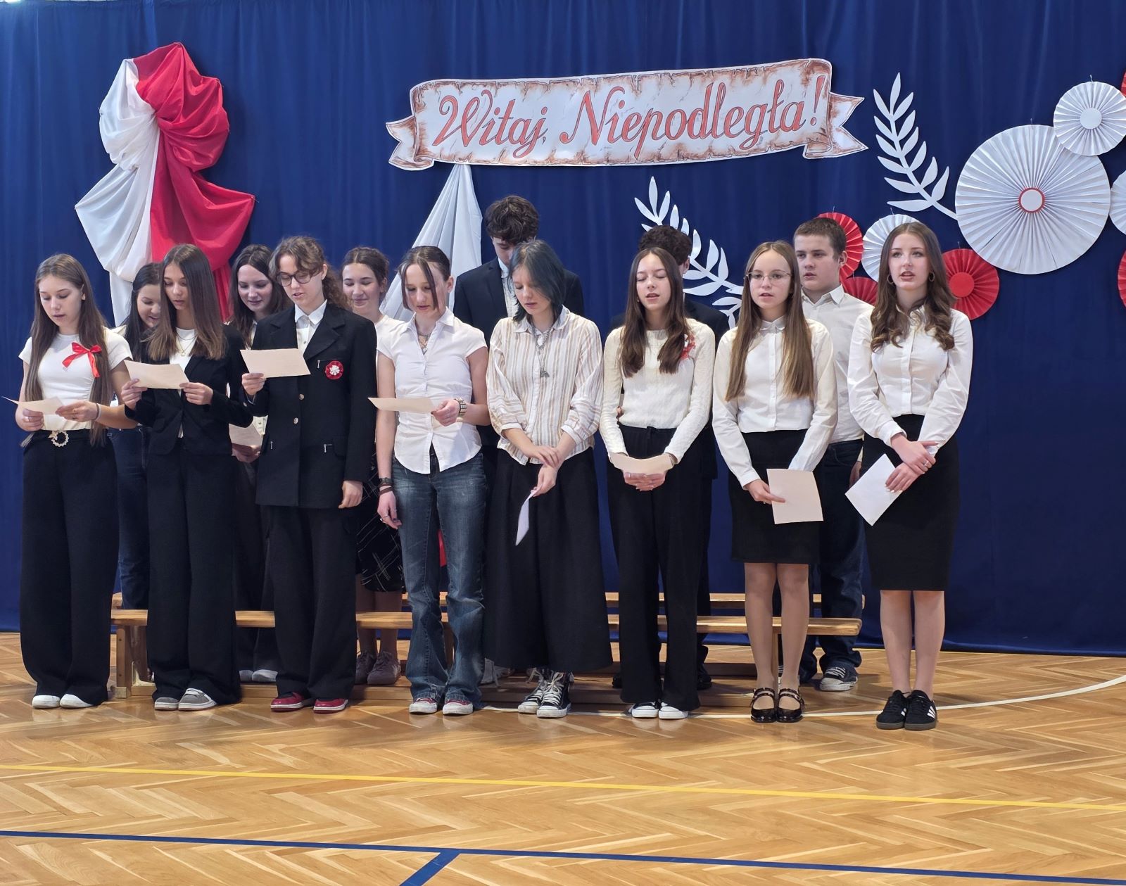 W piątek, 7 listopada, w naszej szkole odbyła się uroczysta akademia z okazji Narodowego Święta Niepodległości. Uczniowie uczcili ten wyjątkowy dzień koncertem pieśni patriotycznych przygotowanym z wielkim zaangażowaniem i sercem. Całość uświetnił występ szkolnego zespołu tanecznego „Love Dance”, który pięknymi układami tanecznymi wprowadził wszystkich w podniosły nastrój uroczystości. Podczas akademii każda klasa zaprezentowała wybraną piosenkę patriotyczną, tworząc wspólnie wyjątkowe widowisko pełne wzruszeń, radości i dumy z bycia Polakiem. Uroczystość była nie tylko artystycznym przeżyciem, ale także okazją do refleksji nad historią naszej Ojczyzny i znaczeniem wolności. To wyjątkowe spotkanie przypomniało nam, jak ważne jest pielęgnowanie pamięci o bohaterach i miłości do Polski.