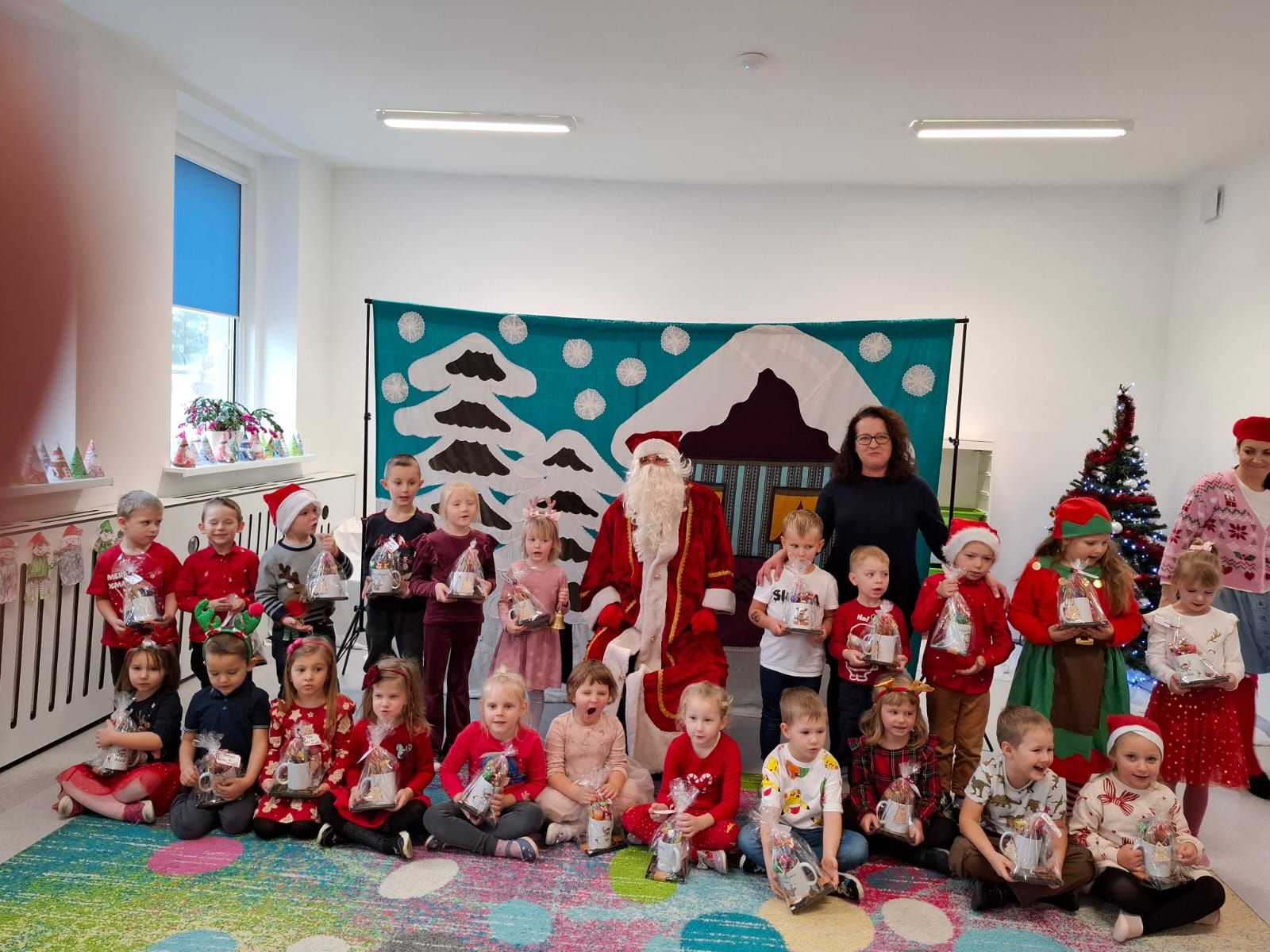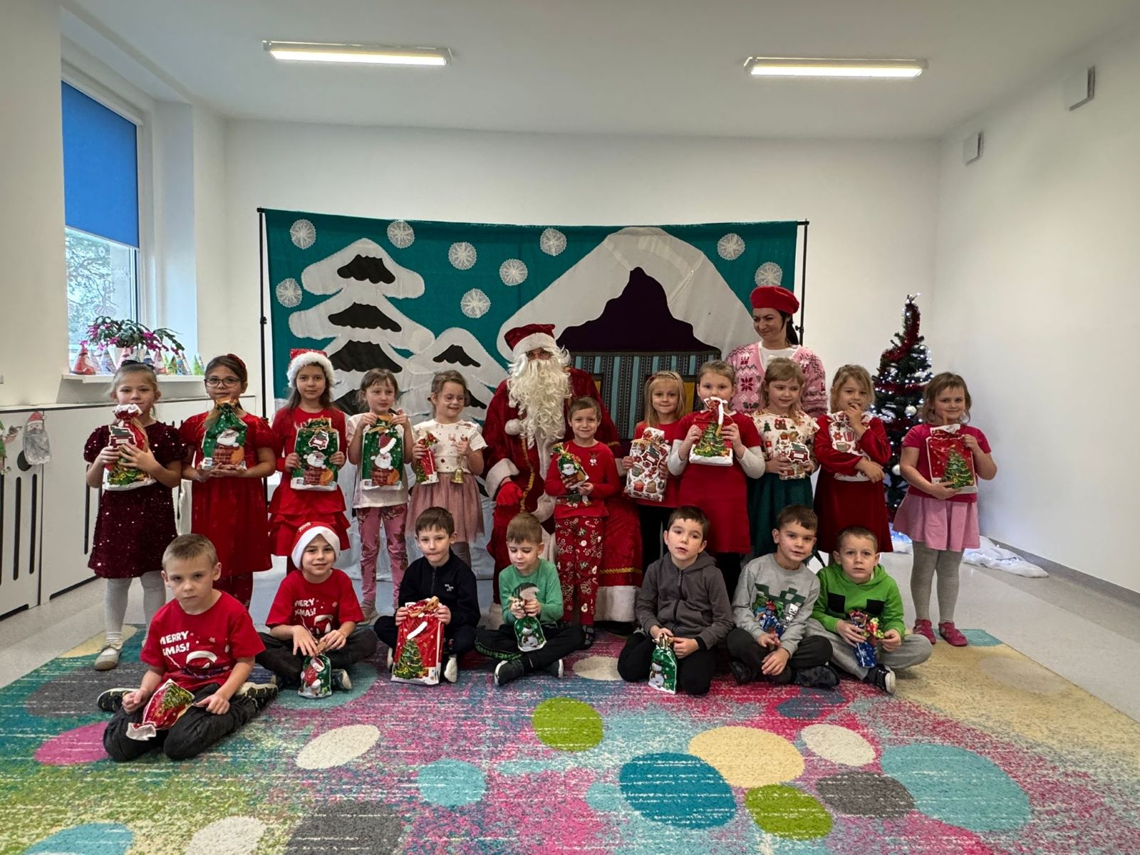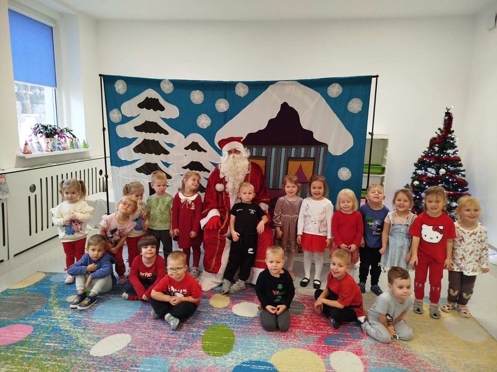 Drugiego grudnia w naszym przedszkolu panowała wyjątkowa, świąteczna atmosfera. Od rana dzieci z niecierpliwością wypatrywały niezwykłego gościa... I wreszcie się pojawił - Święty Mikołaj. Jego przybycie wywołało ogromną radość, uśmiechy i podekscytowanie w każdej grupie. Przed przyjęciem Świętego Mikołaja teatr ,,Skrzat" zaprezentował dzieciom świąteczne przestawienie pt.: ,,List do Świętego Mikołaja". Spektakl wprowadził dzieci w magiczną atmosferę zbliżających się Świąt Bożego Narodzenia.
