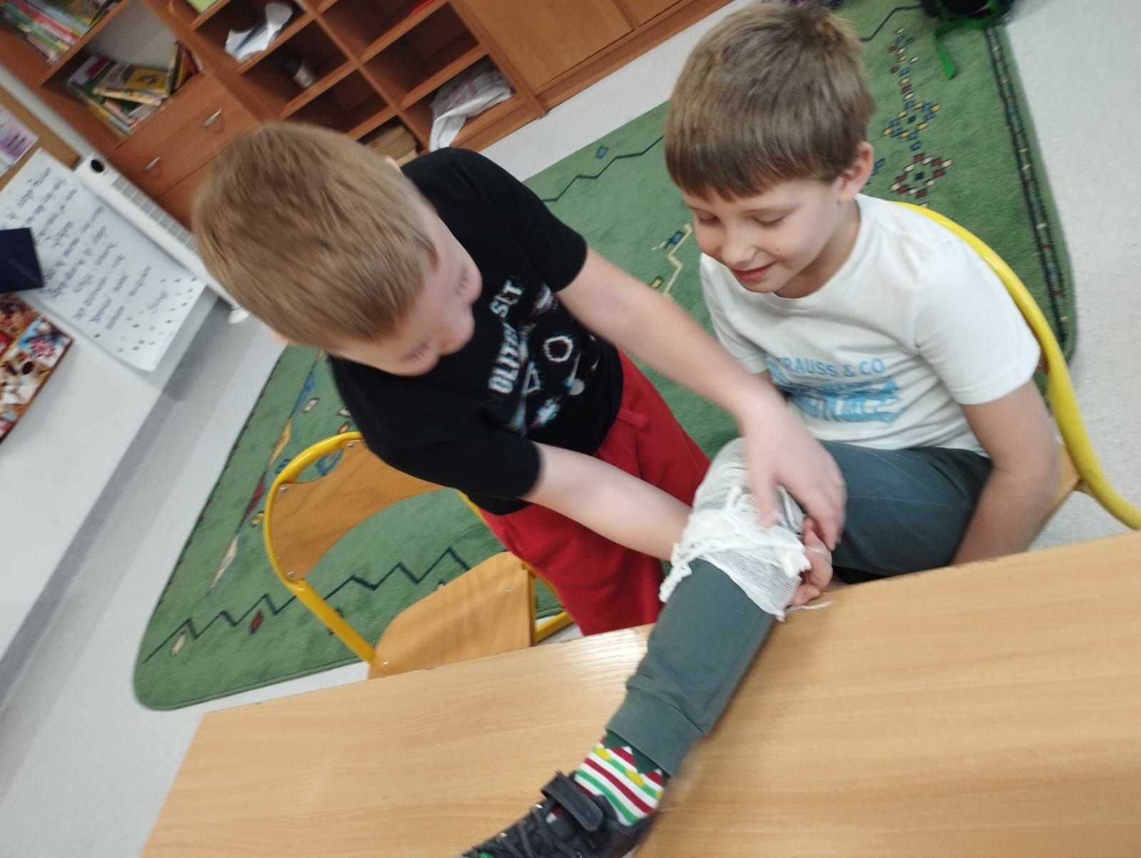 W klasie I przeprowadzono zajęcia dotyczące udzielania pierwszej pomocy. Uczniowie poznali podstawowe zasady reagowania w sytuacjach zagrożenia, takie jak sprawdzenie przytomności i wzywanie pomocy. Dzieci uczyły się również, jak prawidłowo ułożyć poszkodowanego w pozycji bezpiecznej oraz jak korzystać z numerów alarmowych.